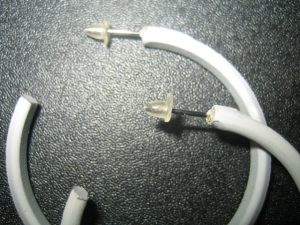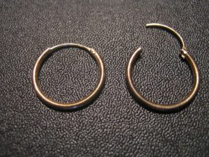 The spring closure is a tube into which you feed a wire. I find these really tricky and have had success only once. There are three things you have to do at the same time. First, you have to keep the wire in your earlobe. Second, you have to stretch the hoop so that the wire can go into it. Third, you have to feed the wire into the little hole at the end of the hoop. All of the action is behind your ear, so you can’t see what you are doing. For me, getting the wire lined up with the hole while also stretching the hoop is next to impossible.