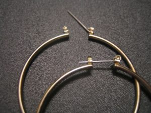 Stud fasteners work exactly the same on hoop earrings as they do for the smaller stud earrings. They are a little more difficult to use in that one needs to attach the fastener by feeling, not by seeing. Sometimes the fastener goes crooked, so you have to bring it back to where you can see it so that you can get it aligned correctly again. With practice, it becomes a lot easier.