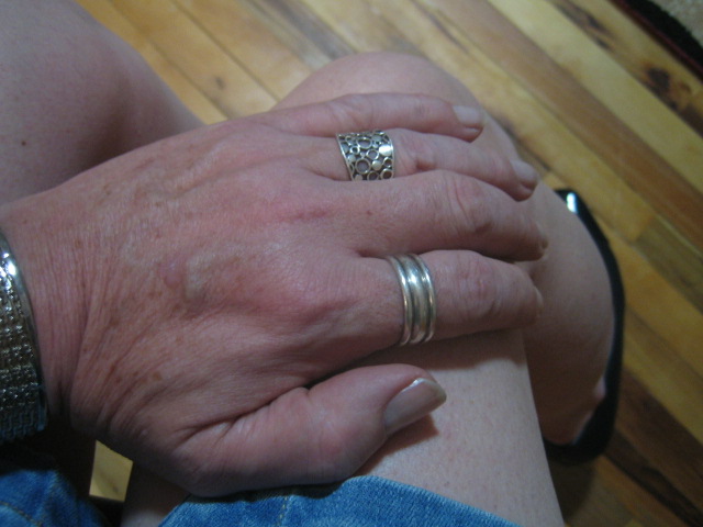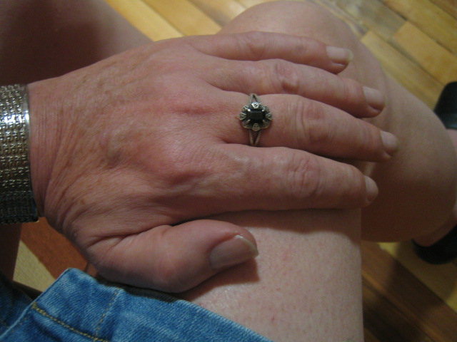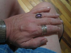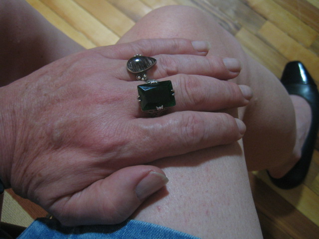 Here I am wearing a couple of rings with large stones. Both have narrow sterling silver bands. The stone on one is pear-shaped, while the other is a large faceted green stone. I had the green ring custom sized by a vendor on eBay.