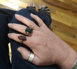 The first if the green ring on my middle finger. It is US size 13, which is very difficult to find. It’s not a problem with this jeweler though, because getting it custom-sized was easy! The red ring on my index finger is also US size 13.