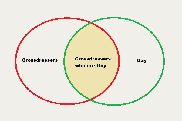 I am in the red crossdresser circle but not in the overlapping area because I am a straight crossdresser. I know people who are gay but not crossdressers. Those people are in the right side of the green circle.