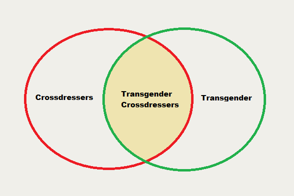 Back when I was in math class, I learned about Venn Diagrams. These represent groups of things, and whether there is an overlap between these groups. I think a few Venn Diagrams will be useful for bringing up some points about crossdressers. These can be useful for understanding where you fit into the big scheme of things, especially when you aren’t quite certain where that fit is.